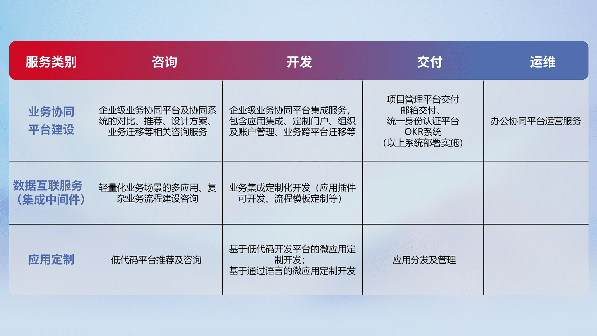 针对钉钉、、、、企微、、IDaas等平台级产品提供产品的规划、、方案、、、交付、、、定制化开发等服务,,,实现如统一协同办公、、智能客户服务、、、、混合会议管理、、智能数据查询、、、等业务场景,,实现数字化转型。。。。